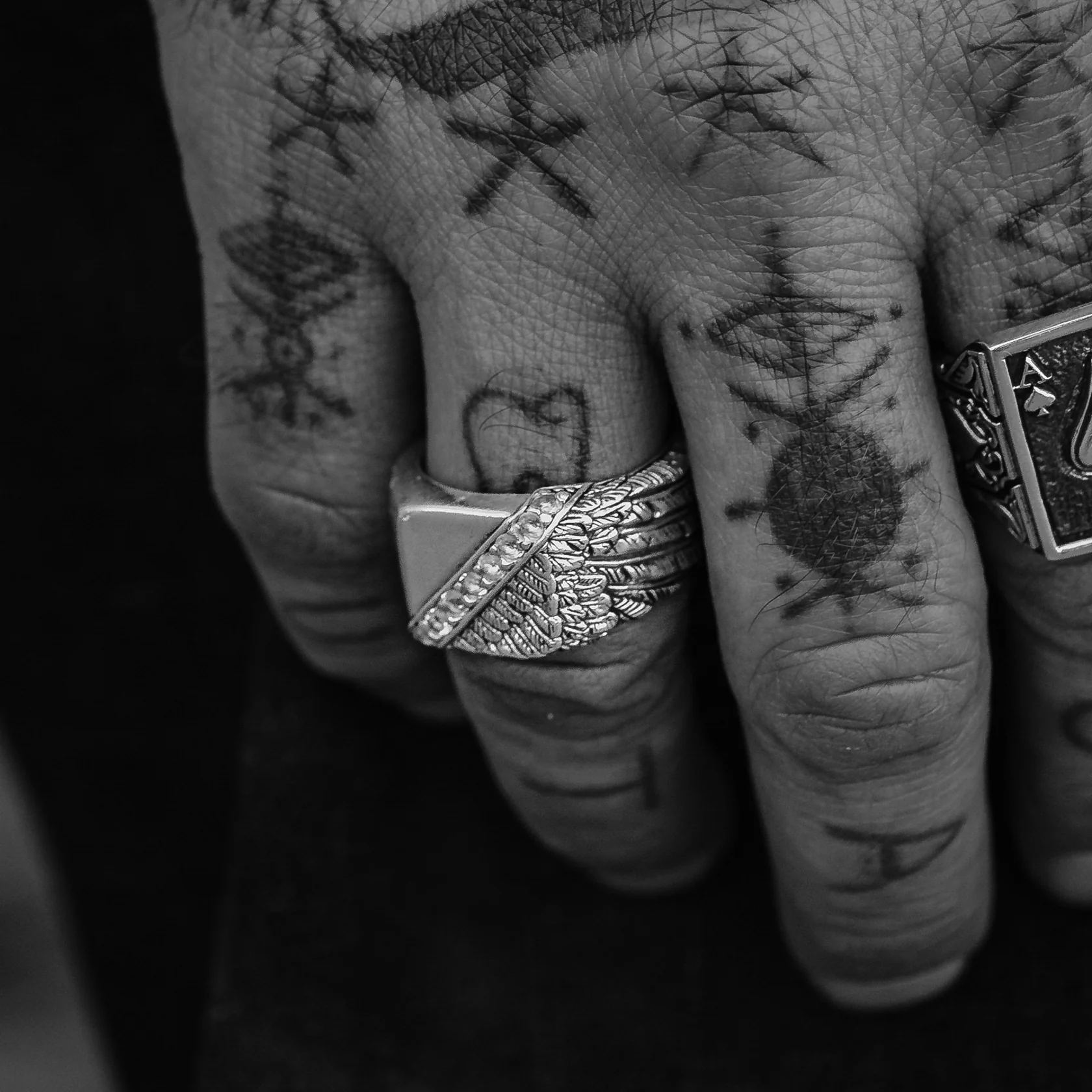 A feather is said to be a gift from the sky, the sea, and the trees — representing trust, honour, and freedom. Featuring a split design of half feathers and half polished sterling silver, topped off with a row of white topaz diamonds. This ring is an ode to the simple things in life, a reminder to cherish what has been given to you.