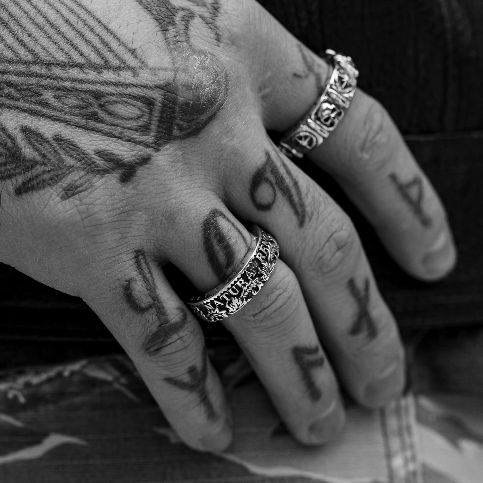 Bearing the harrowing Latin inscription âInge natura renovatur integraââwhich translates to âThrough fire, nature is reborn wholeââthis ring features carved letters taken over by ivy, a symbol that life always finds a way.