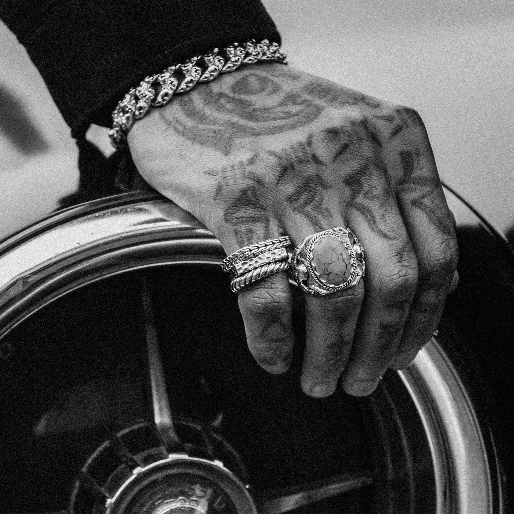 Taking its name from the Latin word for “three,” these stackable rings are substantial enough to wear on individual fingers, but form a well-textured trifecta when worn together.